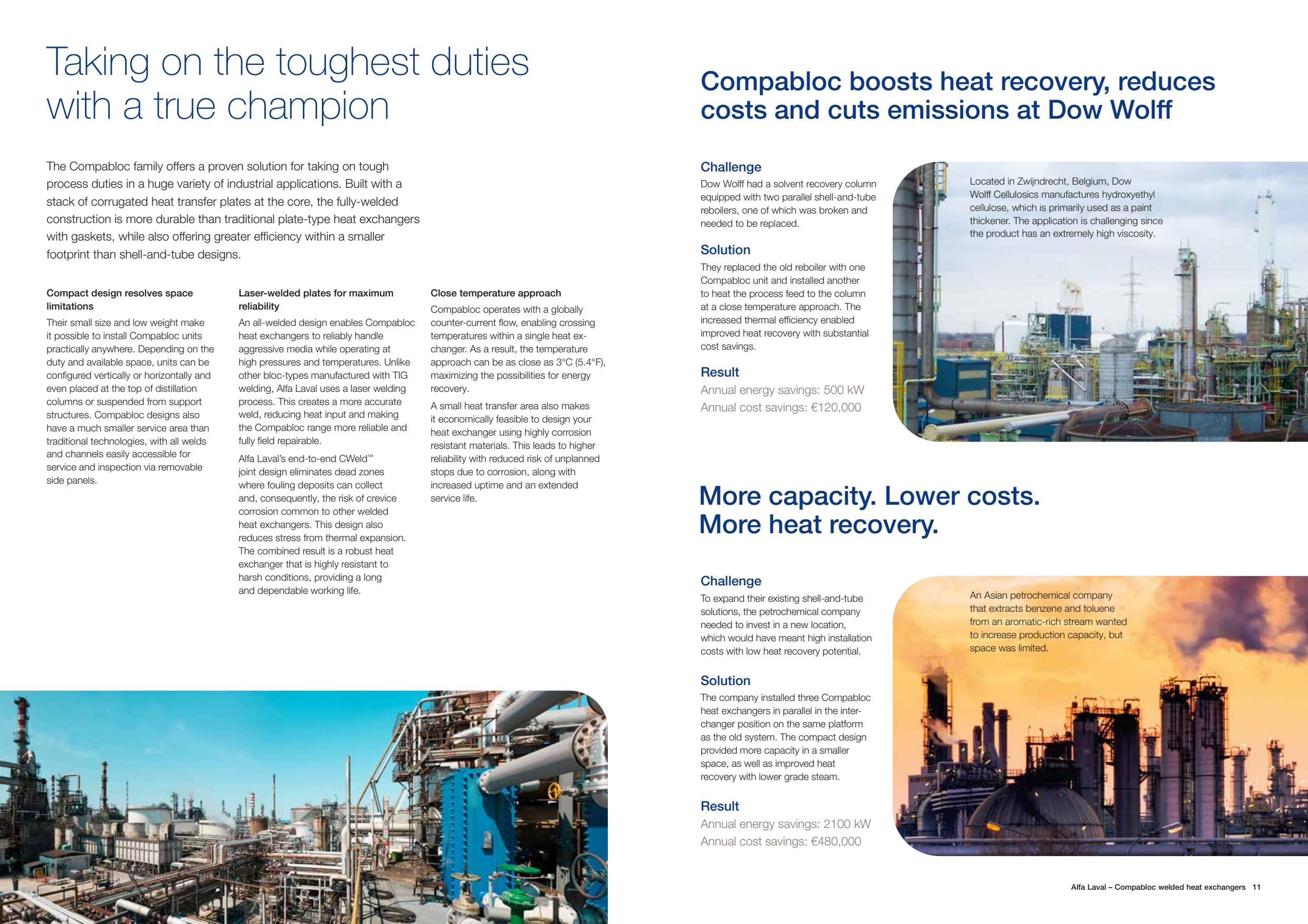 열교환기는 한 유체에서 다른 유체로 열을 지속적으로 전달하는 장치입니다. 이 장치는 가열, 냉각, 증발, 응축이 가능하고 유체와 장비를 적절한 온도로 유지할 수 있으며 폐열을 회수하여 다른 용도로 사용하는 등 열을 사용하는 산업 공정에서 다양하게 활용됩니다. 세계 최초로 판형 우유 살균기를 실용화한 1930년대부터 현재까지 알파라발은 세계 최대의 판형 열교환기 공급업체로서 다양한 신제품과 기술을 지속적으로 개발해 왔습니다.